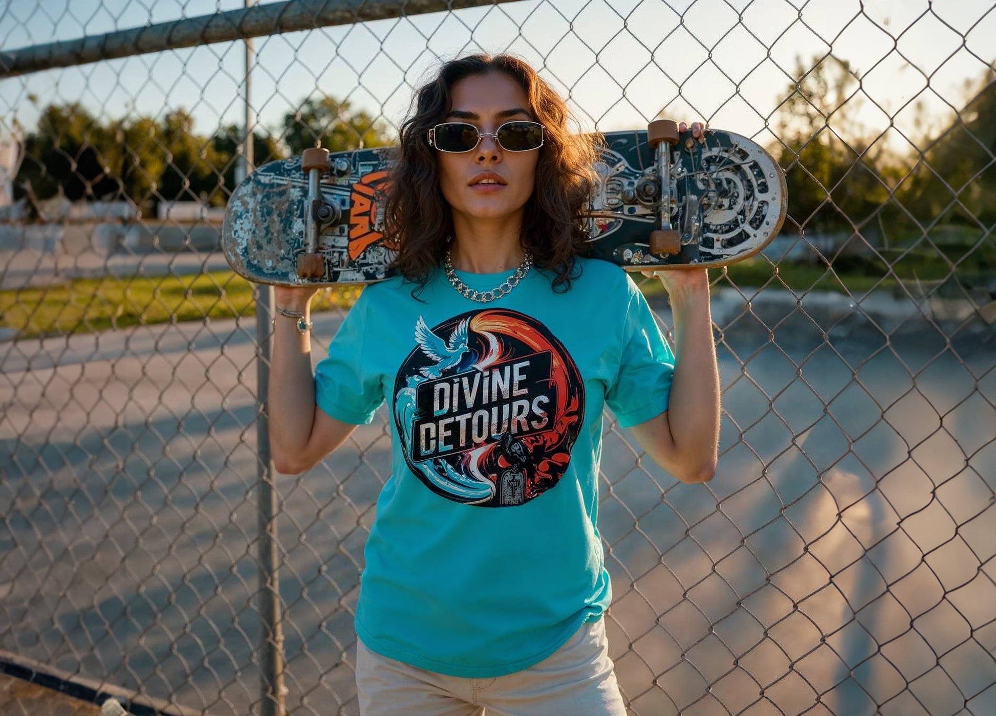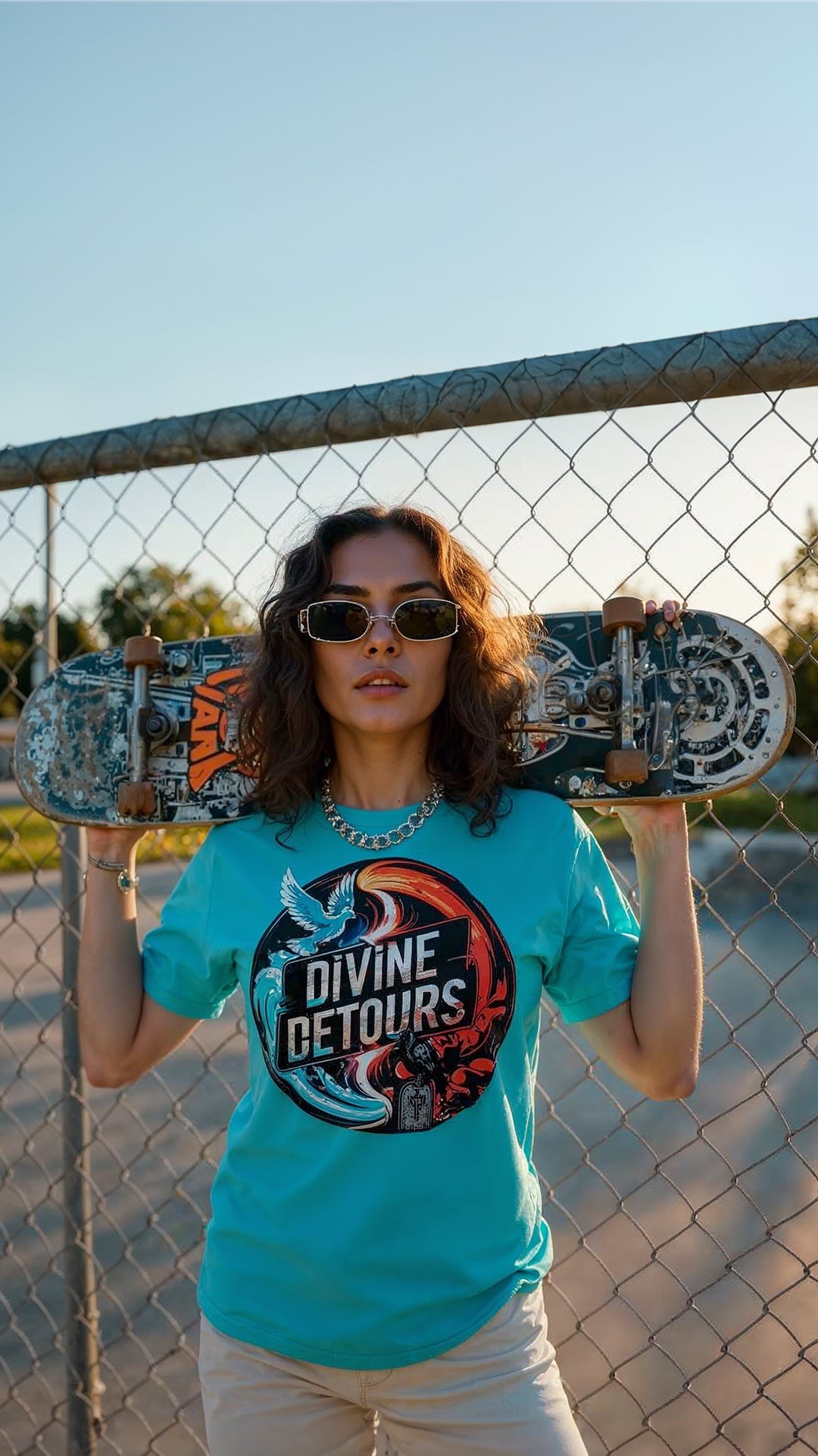 The “Divine Detours – Circle Edition”. For those who’ve taken unexpected turns, skated through struggle, and soared with purpose, this shirt speaks your truth in bold colors and bold design.