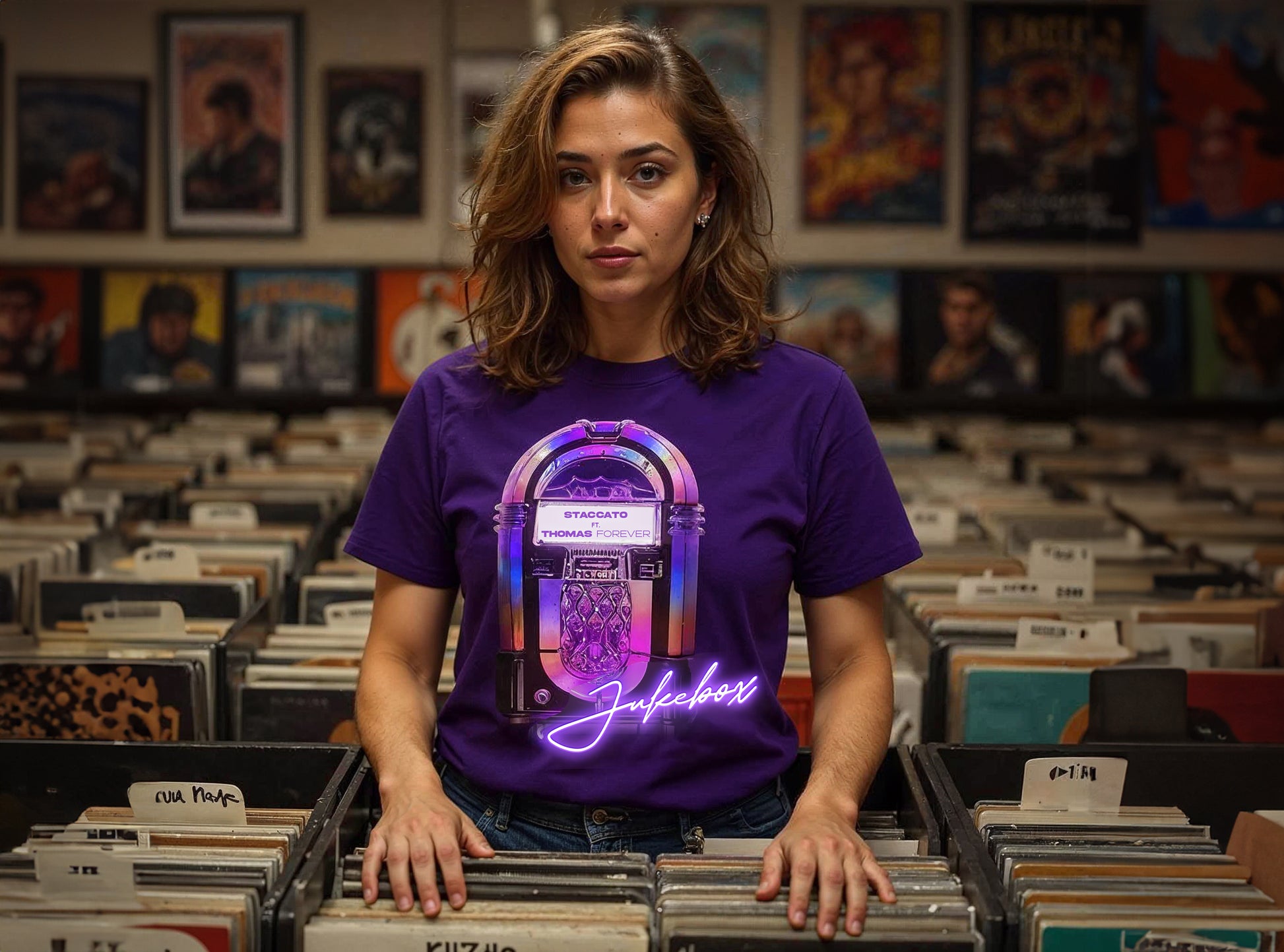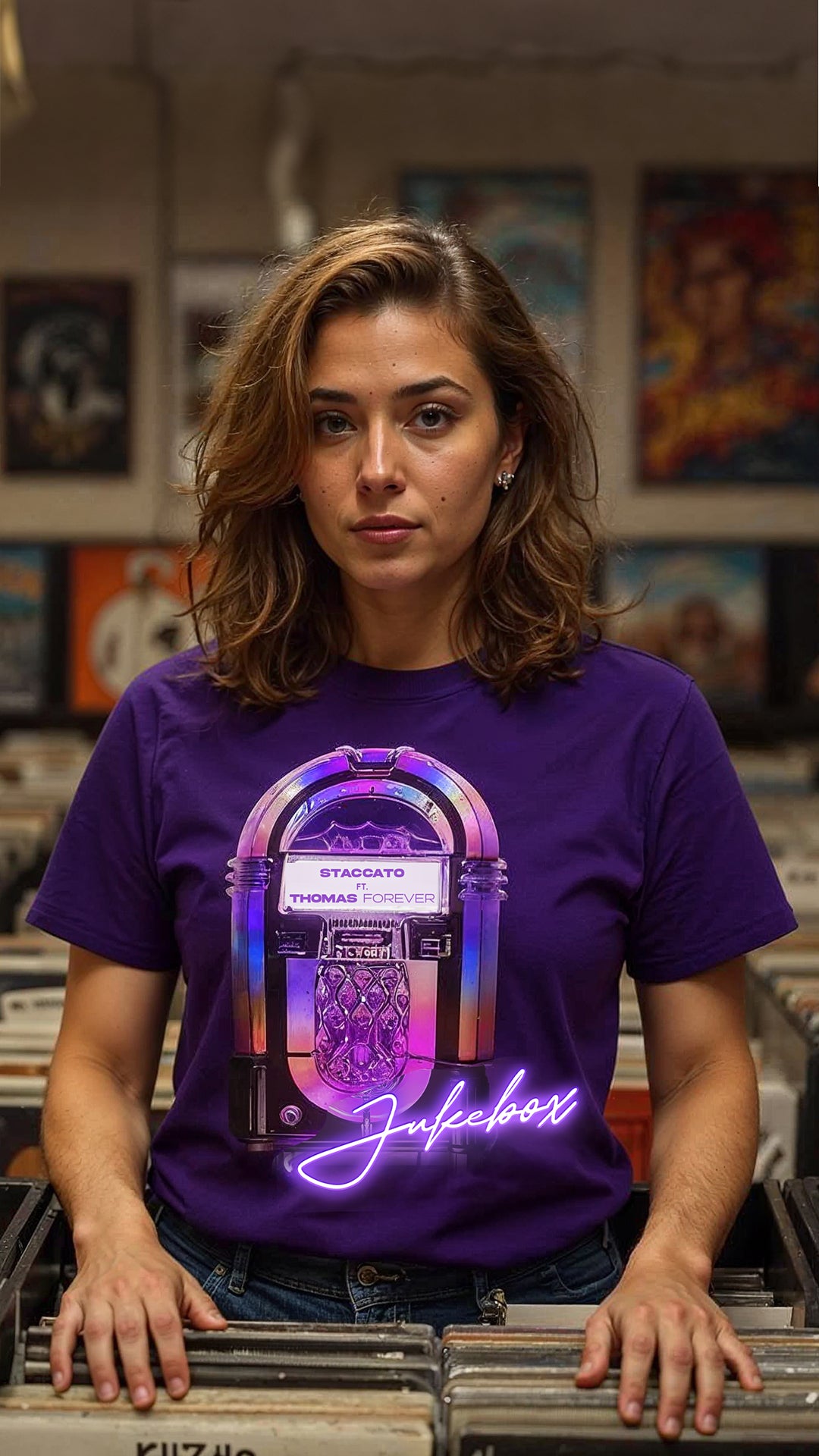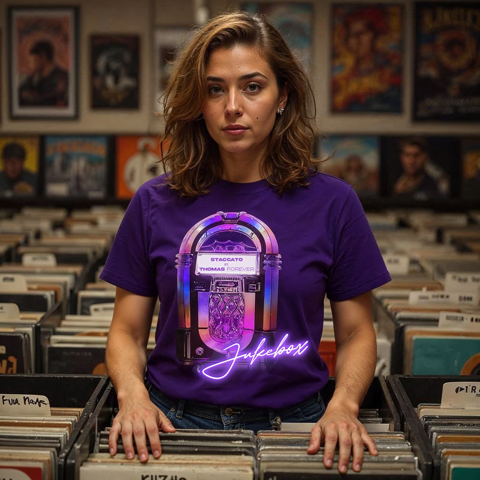 Showcasing a radiant, retro jukebox glowing in electric purples and pinks, this graphic sets the tone for style and soul. Itβs more than fashion β itβs a music loverβs heartbeat.