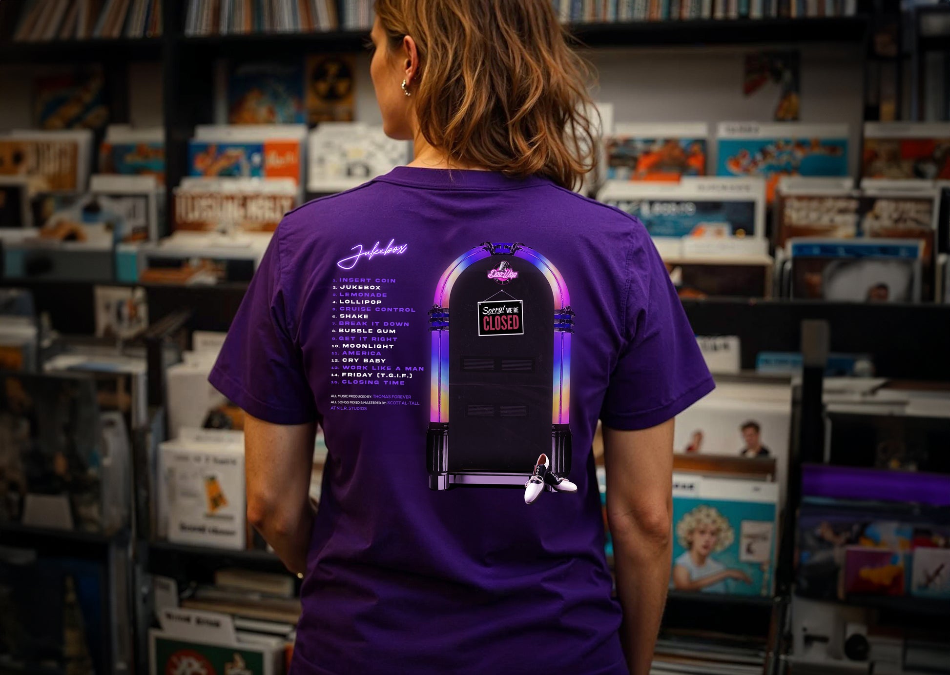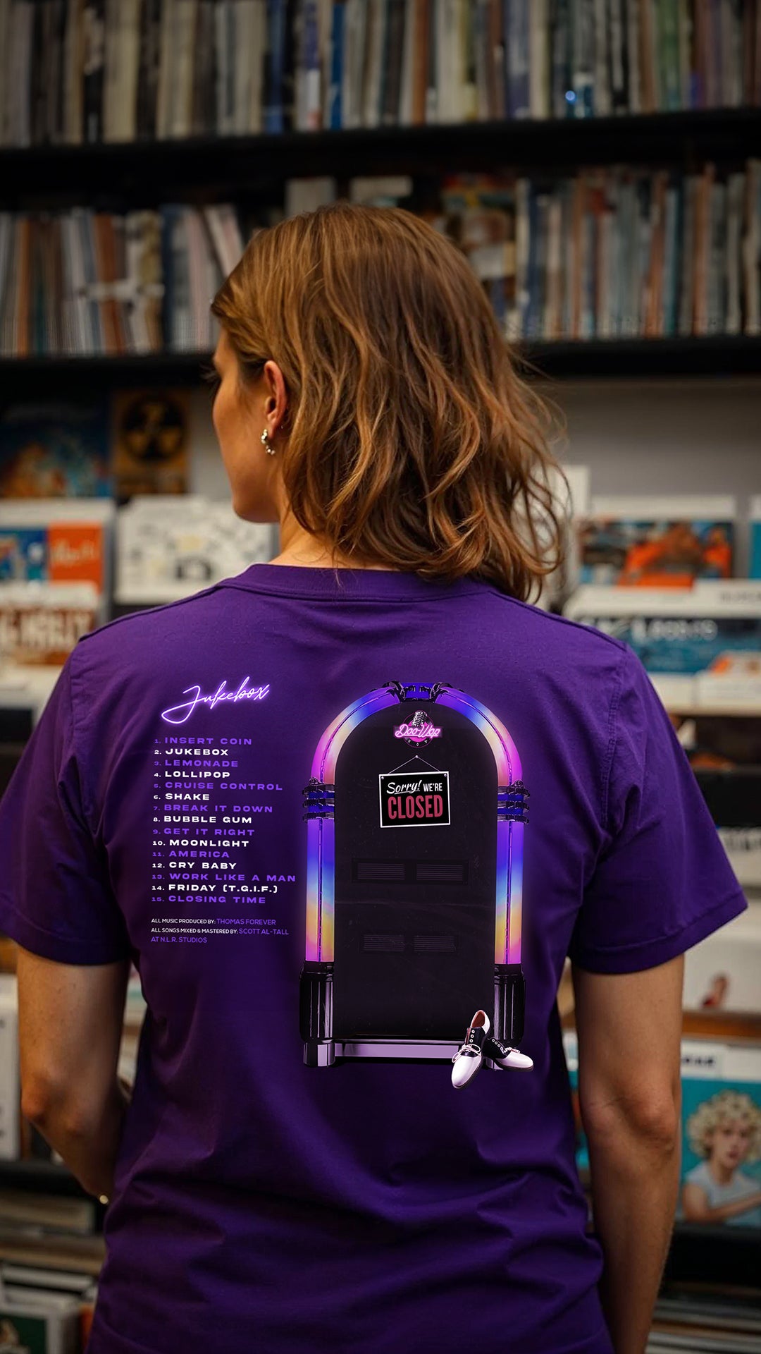Flip it around to unveil a jukebox playlist-style tracklist of bops like βBubble Gum,β and βLollipop,β finished with the clever touch of a βSorry, Weβre Closedβ sign. Each song title echoes a nostalgic era, turning your back into a billboard of throwback hits.